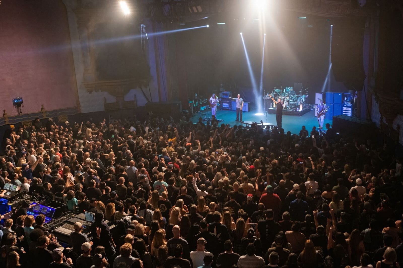The Majestic Ventura Theater is a small 1200 capacity theater located in Ventura, a coastal town 70 miles north of Los Angeles. It was built in the 1920’s during the oil boom, and originally designed to be a movie theater, but there were no films playing on Wednesday night. Instead, anxious fans circled the block waiting for the doors to open at 7:00pm, mostly hidden from passing traffic by the fleet of semi-trucks and production vehicles needed to haul the equipment and band – definitely an out-of-place visual oddity in such a quaint town.