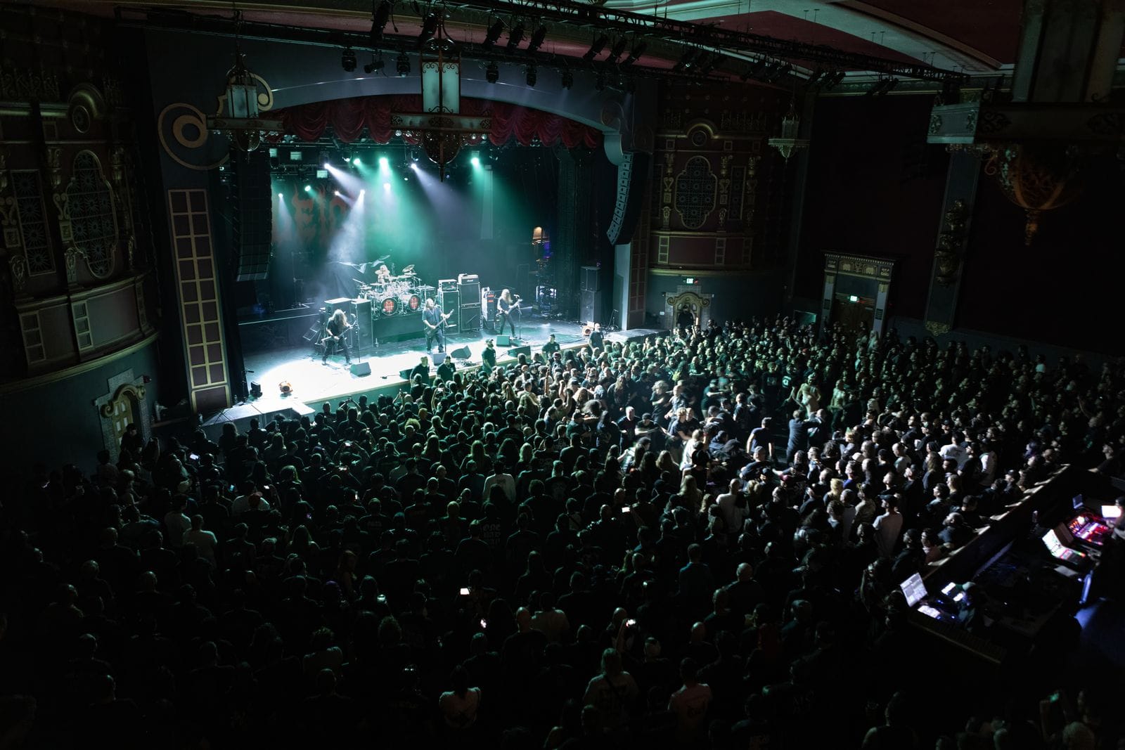 The night started off on a bad note, as I made the three-and-a-half-hour drive from Los Angeles to San Diego to catch the opening night of Behemoth’s “The Godless IV Tour”, only to arrive at the box office and find no ticket or photo pass waiting for me. As always, I had arrived early in case there was an issue, but as I stood outside on the sidewalk waiting for someone to figure things out, I heard a huge cheer coming up from inside the venue, followed immediately by Immolation launching into their first song, “These Vengeful Winds”. As I stood outside with a dejected look on my face, cameras around my neck, and padded lens pouches on my belt, I heard song after song being played from my unique vantage point on the other side of the 100-year-old wall. Frantic emails were sent and received and time ticked by. When I finally heard my name called from behind the glass window with a sign saying, “Sold Out – Not Even One Ticket For Sale”, Immolation’s set had been over for a while. Ticket in hand, and photo pass sticker freshly pasted on my laminate, I raced around the building to the entrance, unloaded all my gear for the security check, scanned my newly acquired ticket, and booked it into the 1100 capacity theater that was already completely full of metal maniacs, arriving at the photo pit at the exact moment that the lights flashed and Rotting Christ hit their first note.