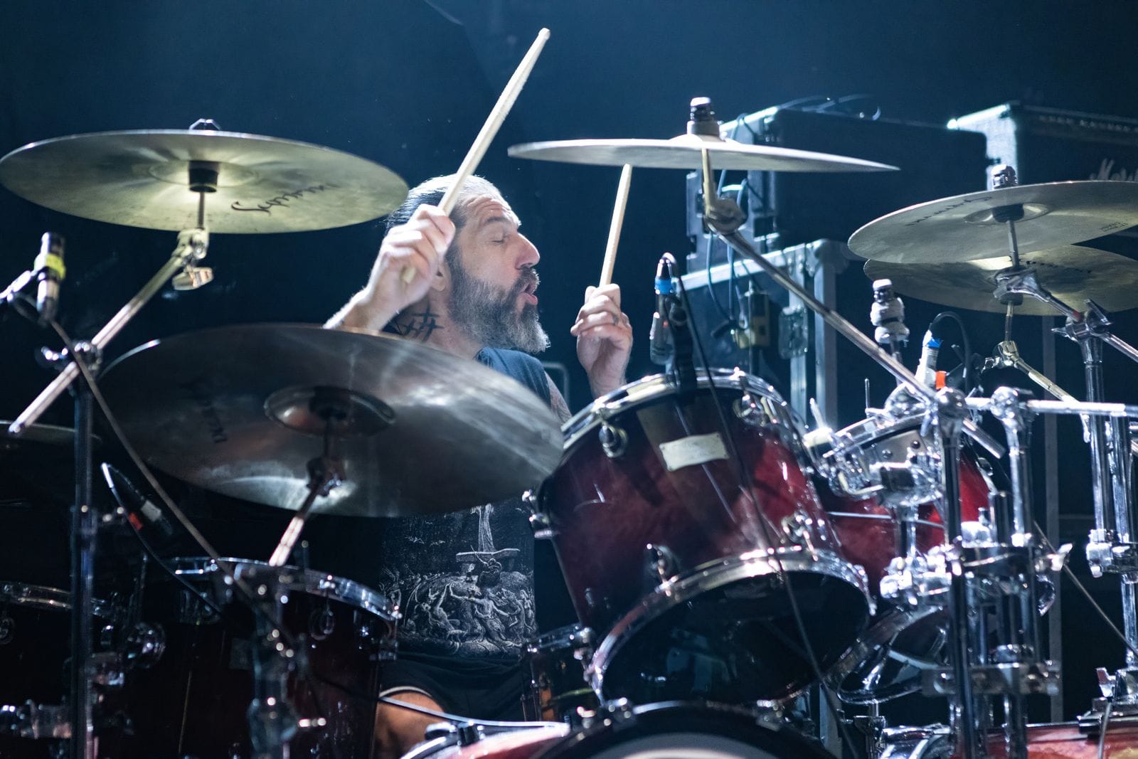 The lighting was spectacular and changed dramatically with each song. The band made full use of the stage, with both Orion and Seth walking up the stairs that led to Inferno’s drum riser at various times. Nergal stayed center stage at his microphone until he’d suddenly dash off left or right, play for a moment, then return to center. This was a big production, and the stage, lighting, and sound were all top-notch. Behemoth have been doing this since 1991, and their experience showed – they are a great live band, and as polished as it already was, you would never know this was the first of twenty-six stops on the US tour.