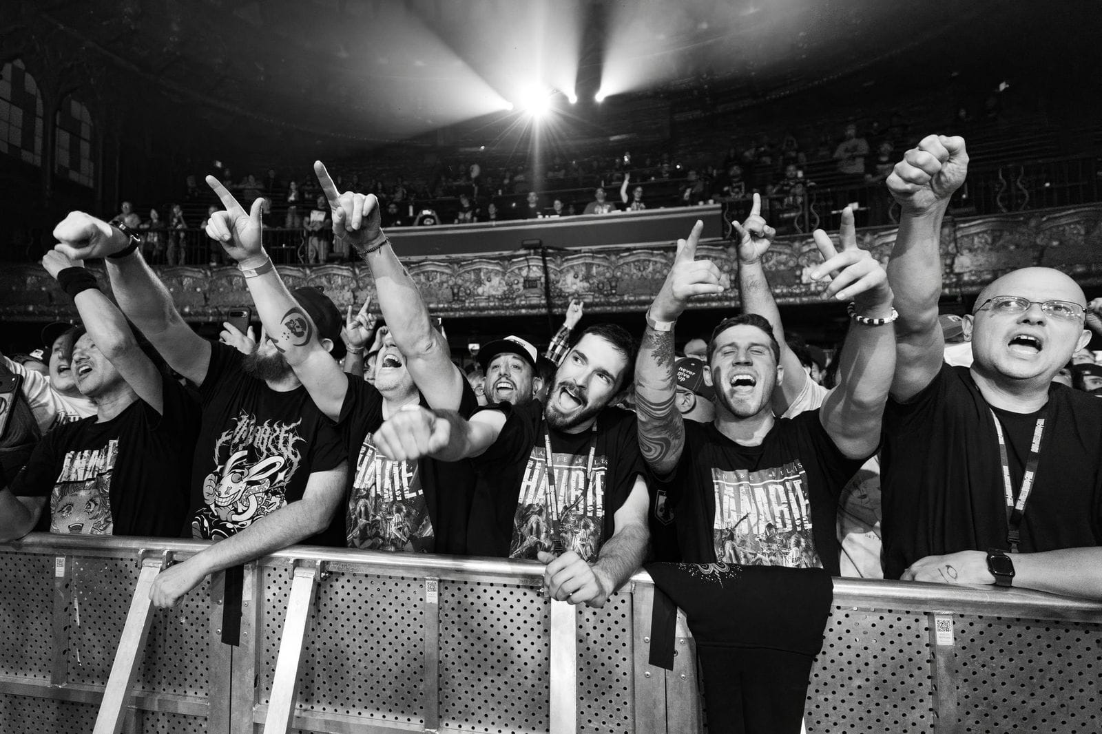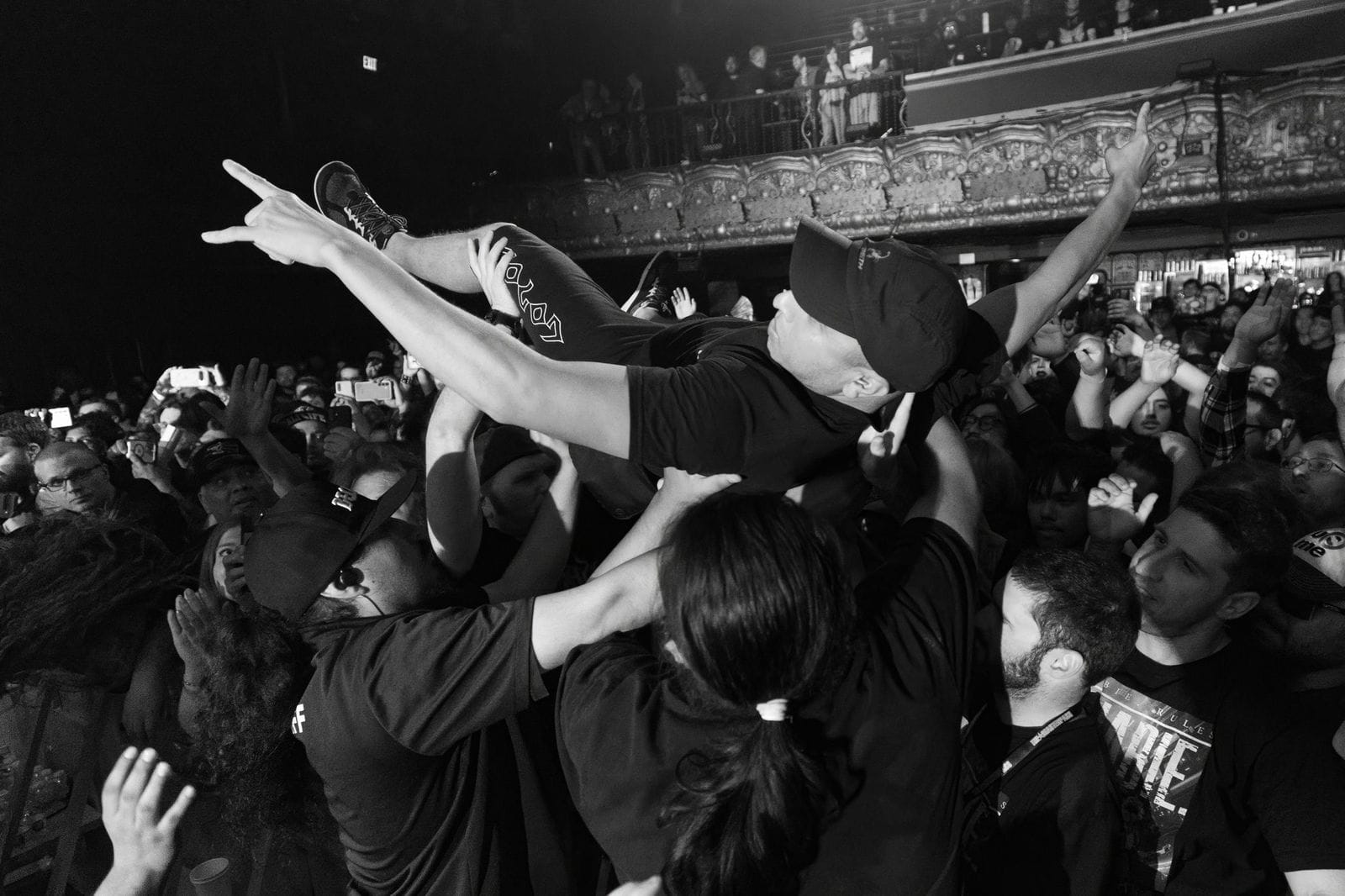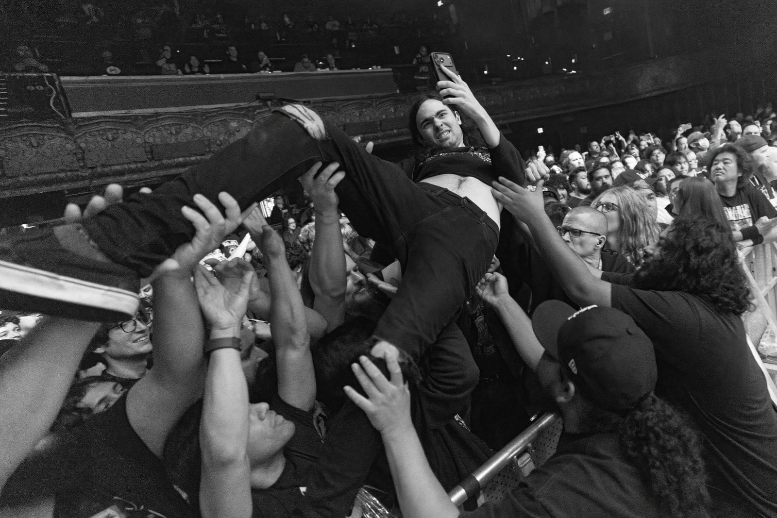 After my three songs in the photo pit, I went to the upstairs balcony to observe the rest of the show from above, where I could get a good handle on both the band and crowd, and what I saw surprised me. I locked in on one man on the floor – he was tall, had white hair, and was probably mid-60’s. He would alternate between getting throttled and knocked to the ground several times in the pit, before standing just in front of the pit singing every single lyric at full volume despite them not being in English, air drumming in perfect time with each drum fill, and pumping his fist in the air on beats of punctuation, obviously knowing each song by heart. He wasn’t the exception to the rule.