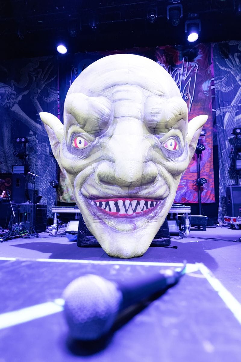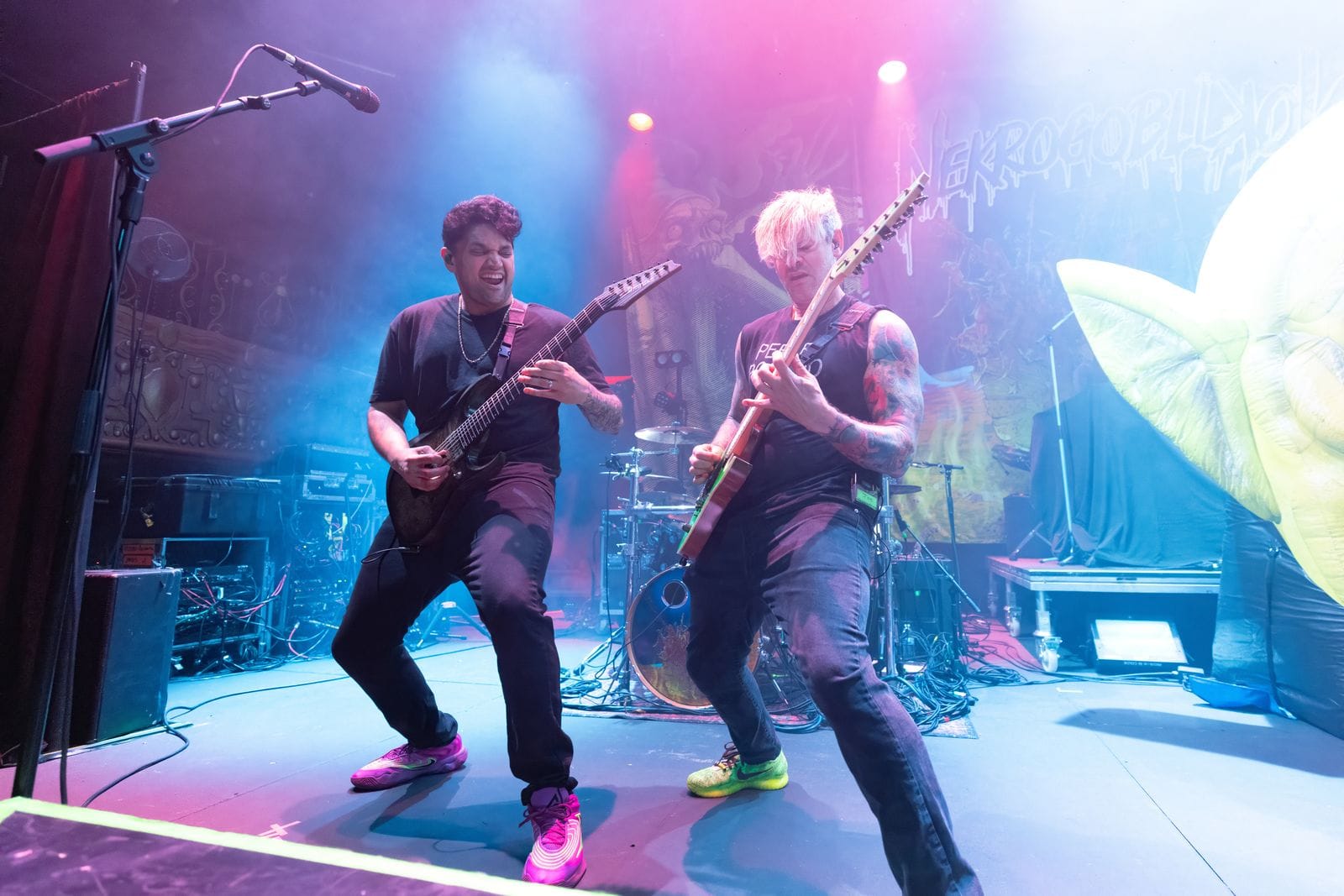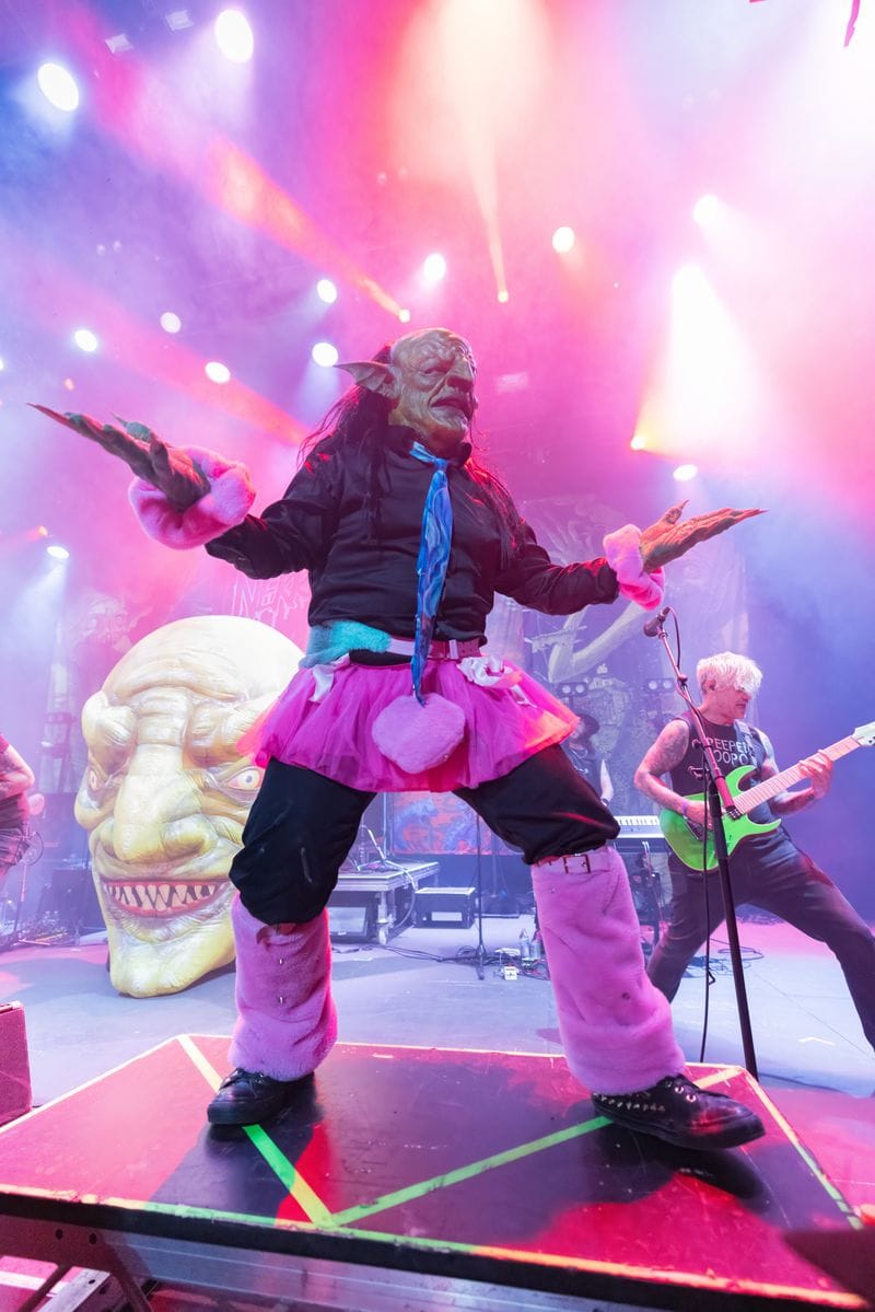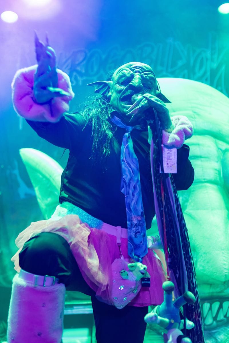 I had never seen Nekrogoblikon before, but knew a bit about them. Still, it was somewhat shocking when the ten-foot-tall inflatable green goblin head was revealed, and the band made its way to the stage. I knew about John Goblikon and his green mask and hands, but was unprepared for everything else, like his pink tutu, and propensity to dance like he’s opposite Uma Thurman in Pulp Fiction, or the need to hump fellow bandmate’s leg mid-song. He started off by saying “Hello Encino” (a town in the Valley – a part of Los Angeles County, but far away from downtown where the show was), and continued to refer to us as being from Encino for the rest of the night.