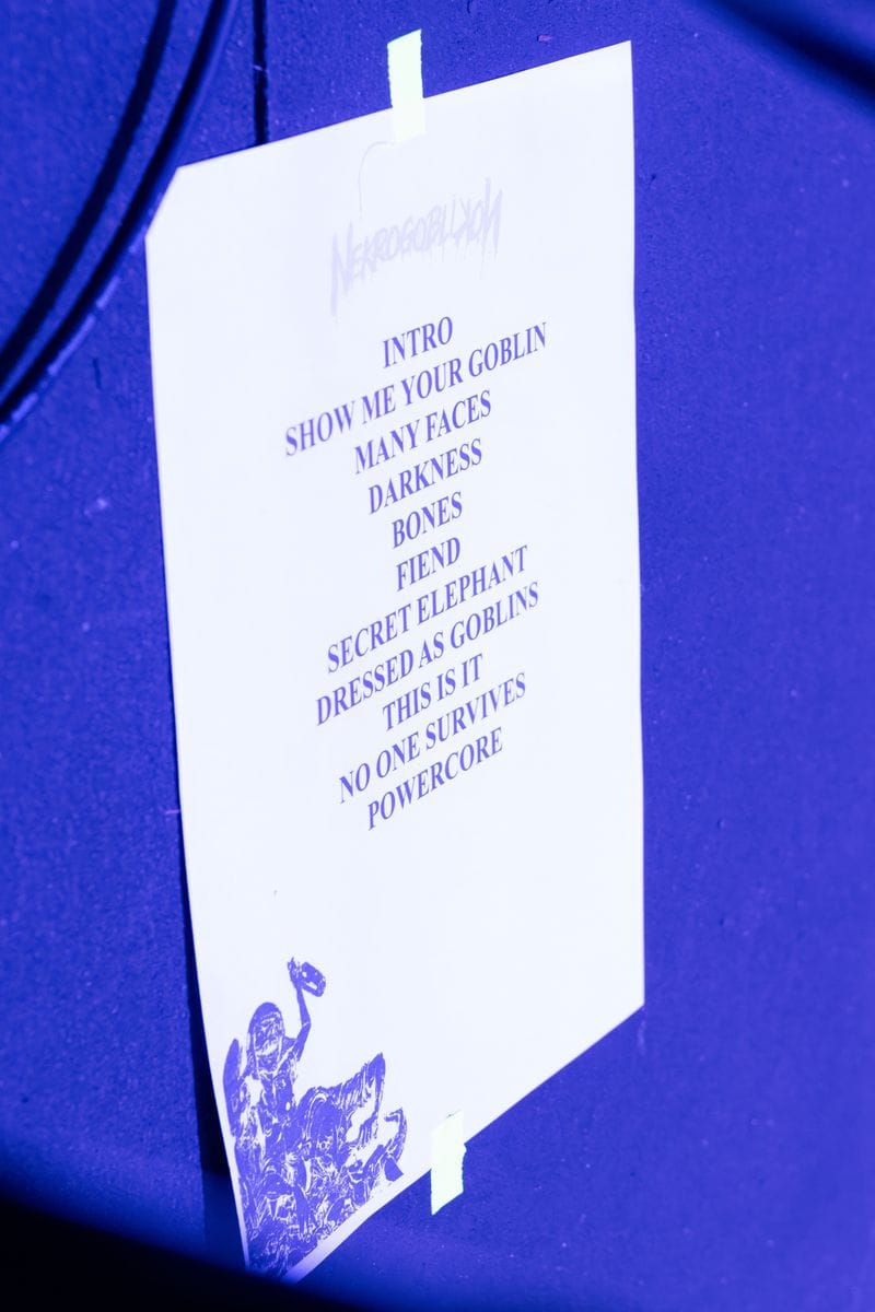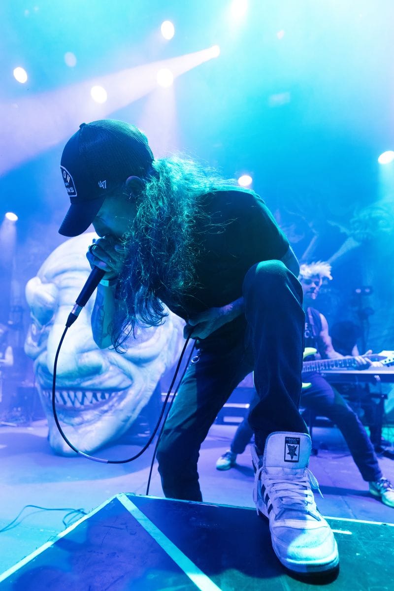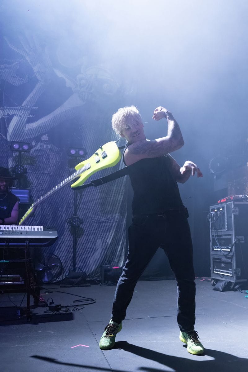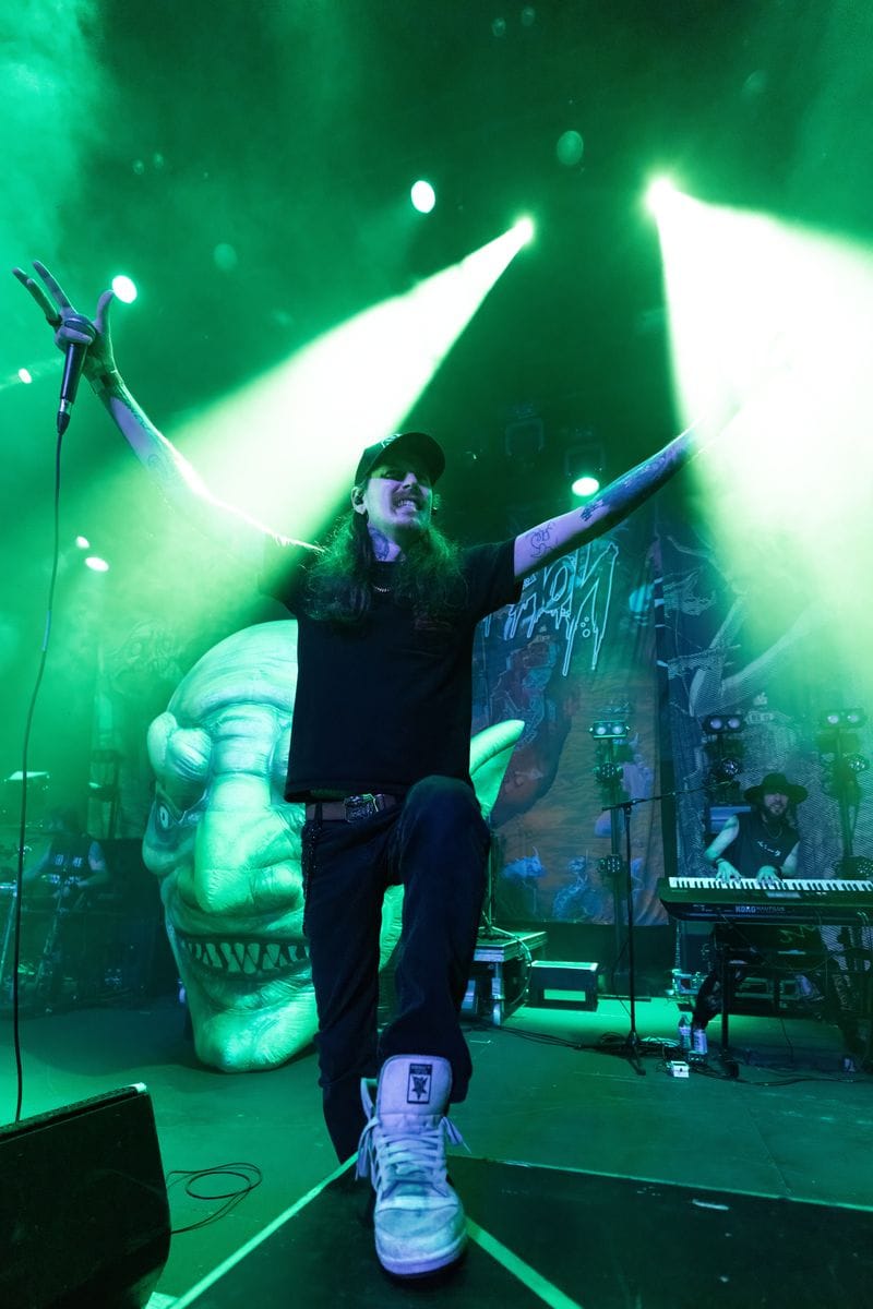 I had never seen Nekrogoblikon before, but knew a bit about them. Still, it was somewhat shocking when the ten-foot-tall inflatable green goblin head was revealed, and the band made its way to the stage. I knew about John Goblikon and his green mask and hands, but was unprepared for everything else, like his pink tutu, and propensity to dance like he’s opposite Uma Thurman in Pulp Fiction, or the need to hump fellow bandmate’s leg mid-song. He started off by saying “Hello Encino” (a town in the Valley – a part of Los Angeles County, but far away from downtown where the show was), and continued to refer to us as being from Encino for the rest of the night.