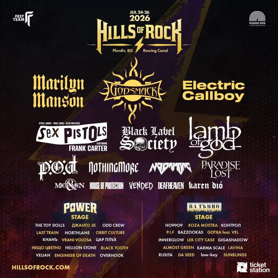 All Bands Include: Marilyn Manson, Godsmack, Electric Callboy, Sex Pistols feat. Frank Carter, Black Label Society, Lamb of God, P.O.D., Nothing More, Nevermore, Paradise Lost, Of Mice & Men, House of Protection, Vended, Deafheaven, Karen Dió, The Toy Dolls, Last Train, Northlane, Orbit Culture, Odd Crew, Khanъ, Vrani Volosa, Tsar Plah, Hellion Stone, Black Tooth, Engineer of Death, Overhook, Django Ze, Neshto Tsvetno, Velian, H09909, P.I.F., Innerglow, Almost Green, Rusita, Koza Mostra, Bazzookas, Lek City Case, Karma Scale, Da Seed, Kontrol, GOTRA feat. VEL, Gigashadow, Lavina, low-key, Sunblinds.