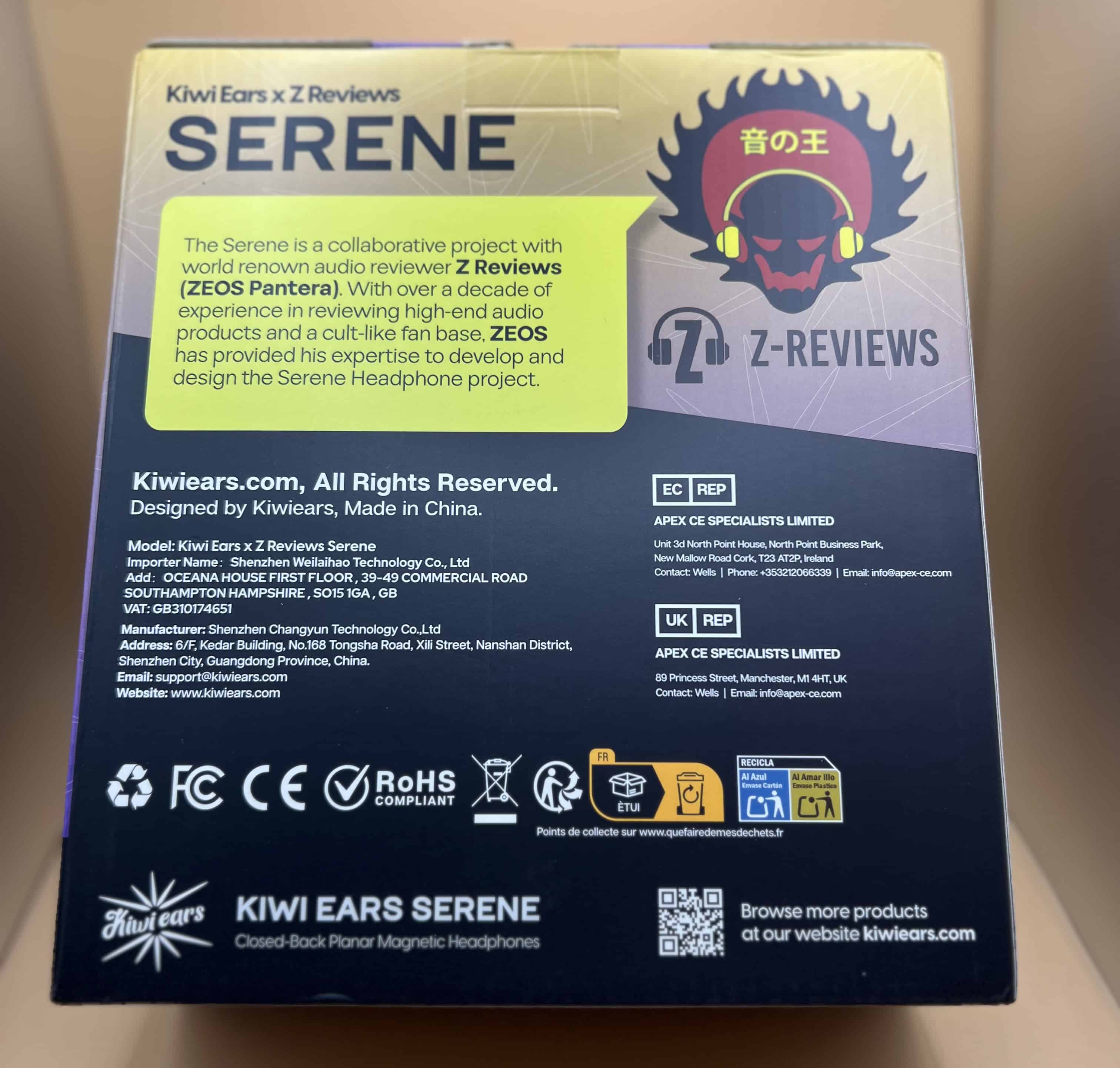 The Serene comes in some nicely designed packaging with a purple aesthetic that matches the design of the headphones' outer shell. The box features both Kiwi Ears and Z Reviews logos, and a brief description of the collaboration on the back of the package.