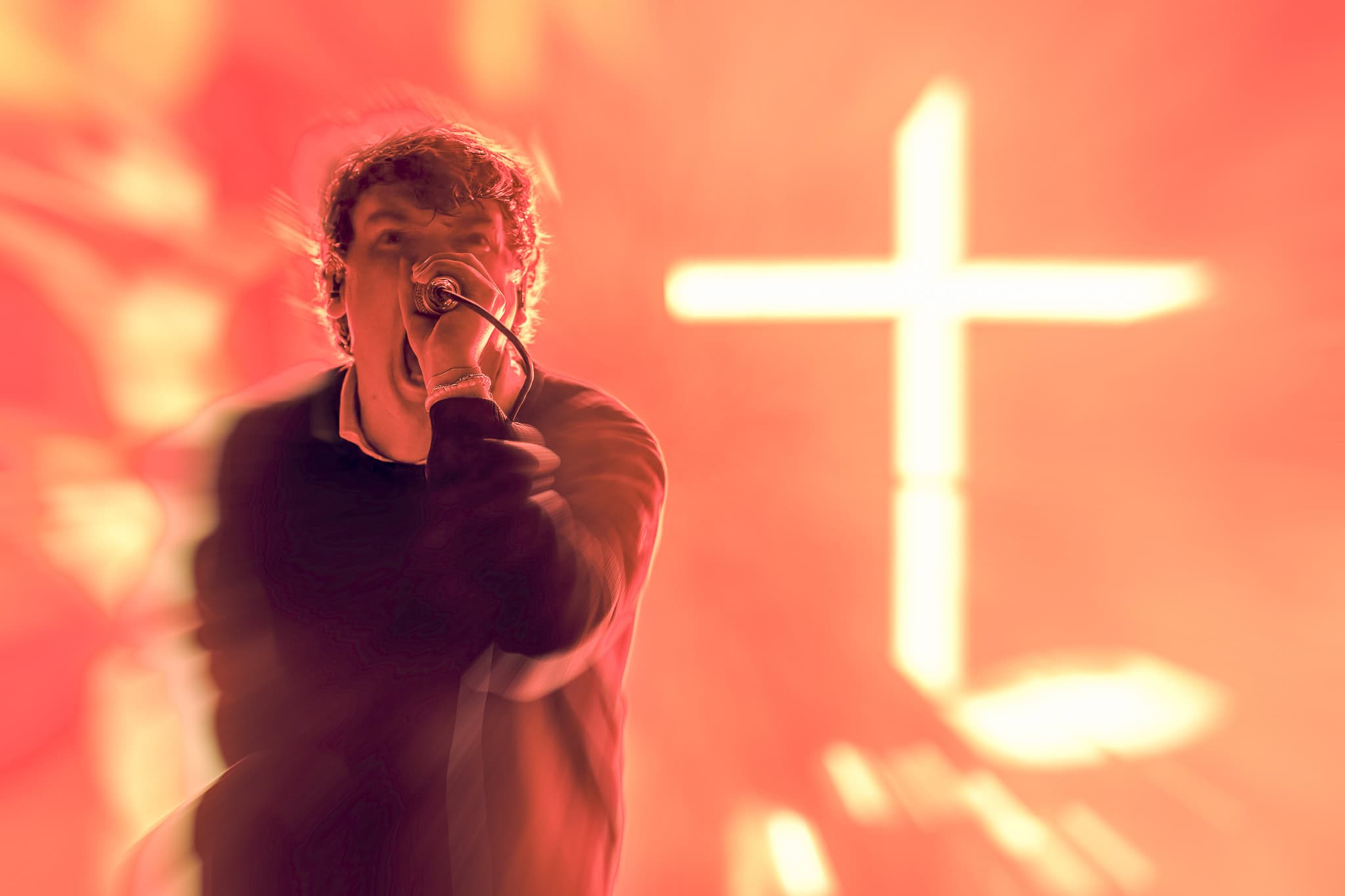Next came Militarie Gun, delivering their unique blend of post-punk and hardcore. Their melodic yet aggressive sound offered a brief but captivating shift in energy. Frontman Ian Shelton’s charisma drew in even those unfamiliar with their discography, as the crowd swayed and headbanged to tracks like “Thought You Were Waving.”