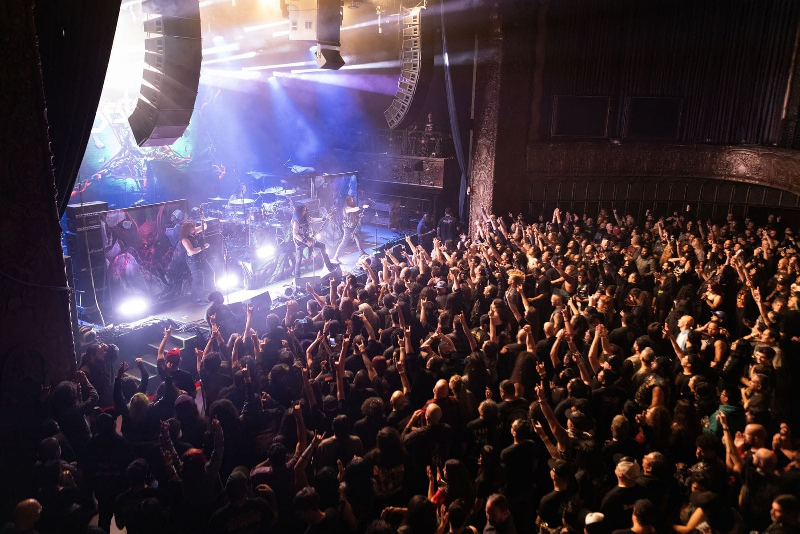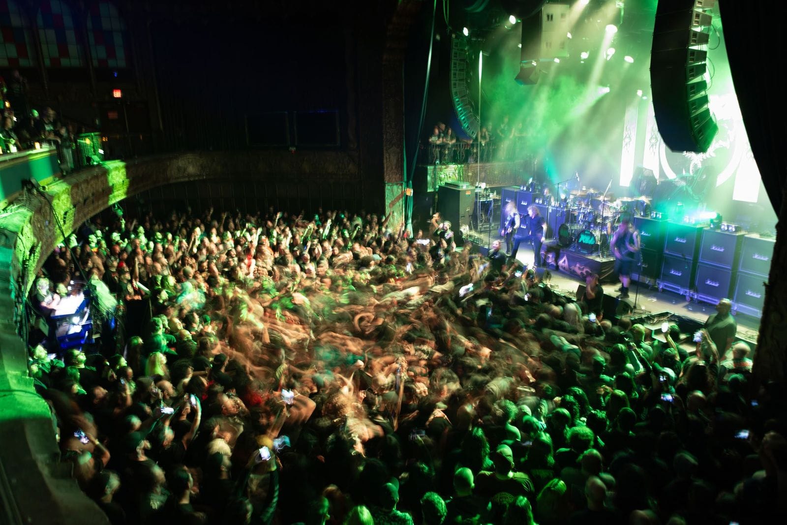 Formed in the Bay Area in 1983, Testament has fourteen albums, is highly influential in the scene, and are fan favorites. An indicator of this lofty position in fan’s minds and hearts was at the merch booth. When entering the Belasco, you first walk into a small lobby before reaching the main concert hall. Bands set up their merch table in this room, and for most bands, there is always interest in the black shirts hung on the wall, but that interest usually wanes when the band takes the stage…not so for any of the